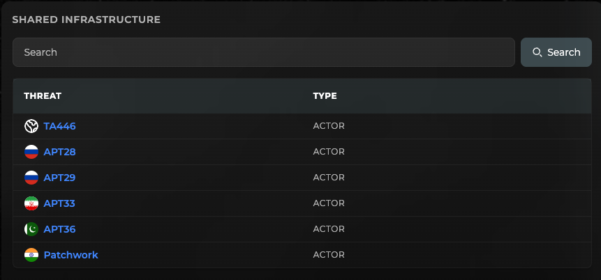 Shared Infrastructure View: We’ve also created a new dedicated view to explore infrastructure overlap across threat actors, surfacing shared resources with country attribution and sponsoring organizations for geopolitical context.